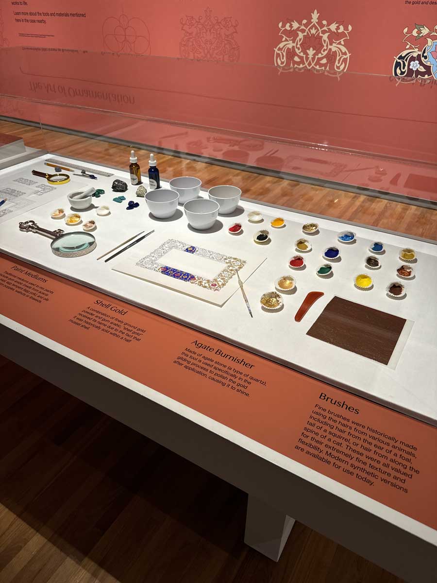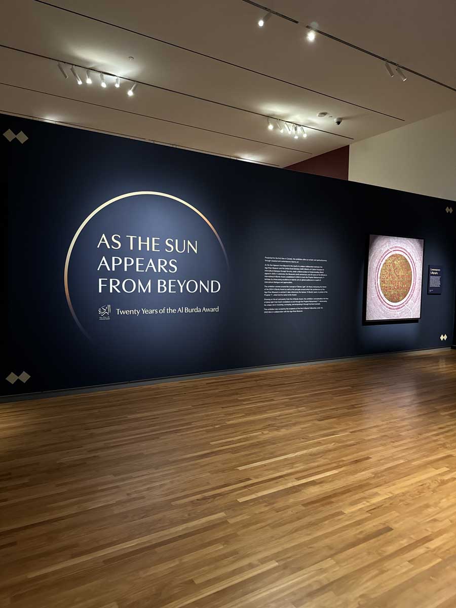 On the second floor, the exhibition The Sun Appears from Beyond: Twenty Years of the Al Burda Award showcases both classical and contemporary works of Arabic calligraphy, poetry, and ornamental design. Visitors are even invited to try their hand at creating their own patterns.
