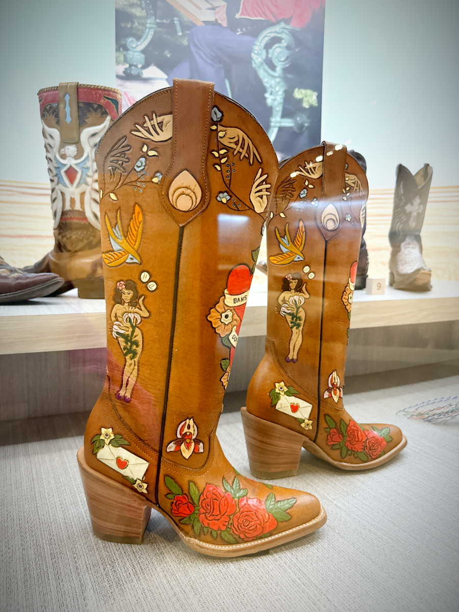 The exhibition presents various boots from brands specializing in cowboy boots, like Charlie Dunn, Hyer, Justin and Lucchese, and also features big fashion houses like Ralph Lauren, who has long romanticized the American West in his work, as well as Louis Vuitton’s latest collection by Pharrell Williams in 2024.