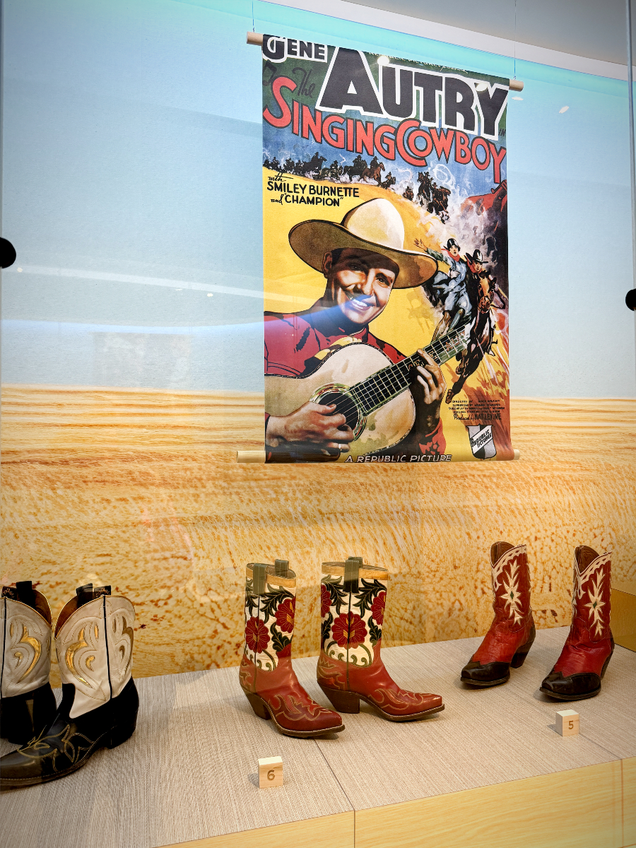 The exhibition looks at how popular culture, particularly movies and music, have influenced the boot’s design. Radio and “talkies” transformed the cowboy into a singing storyteller. Gene Autry was a renowned Singing Cowboy, who loved cowboy boots. A newspaper at the time even noted that he had “a little mania” of buying cowboy boots, which he was constantly wearing. The show displays some of the singer’s boots that were loaned by Autry Museum of the American West.